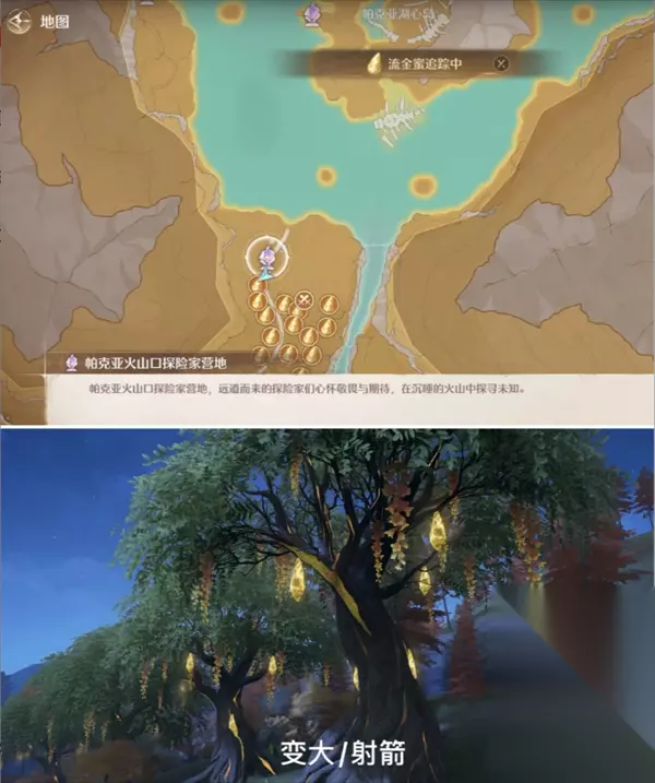 采集-流金蜜: 传送【帕克亚火山口探险家营地】,地图下方方向有一片树林。可以使用变大套咆哮技能,或者使用弓箭瞄准,把果子打到地上后采集。