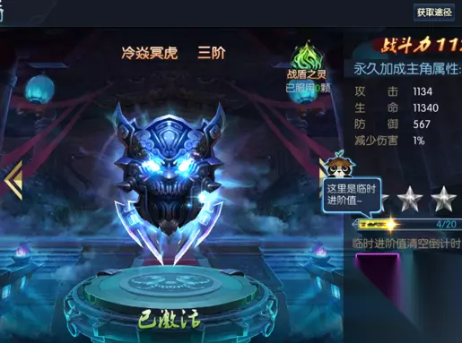 目前在游戏中战盾共有十个品阶,分别为精铜盾甲、银白禁卫、冷焱冥虎、金乌拢尾、狱龙锁天、牛鬼咆哮、烁光千目、紫翎白蛟、震域饕餮和大荒囚神,越高阶的战盾能够提供越强大的属性加成,酷炫的外型也让人心生向往。 提升战盾的品阶需要消耗战盾进阶石,战盾进阶石可通过商城、进阶副本、黑市商人、跨服组队、跨服商店等玩法获得。每次消耗一定数量的战盾进阶石可提供一定的进阶值,当进阶值条填满后即可点亮一颗星星,点亮五颗星后战盾将自动晋升为下一阶级。值得注意的是,在进阶成功时有机会获得系统赠与的临时进阶值,临时进阶值存在时效性,倒计时结束后将会清空。