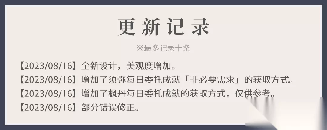 旅行者们好,这里是友人A的每日委托成就频道。为了方便自己以及各位旅行者,笔者整理了蒙德、璃月、稻妻、须弥、枫丹共计五个国家的每日委托成就及其获取方式,并通过一图流的方式呈现出来。 〓阅前须知〓 1、本文内容仅供参考,切不可无脑参照。 2、本文长期保持更新,可放心收藏。 3、如有错误、遗漏,请在评论区反馈。 4、枫丹每日委托成就暂不明确,所列仅为推测,请注意甄别。 5、欢迎在评论区补充枫丹每日委托成就细节,感激不尽。 〓更新记录〓