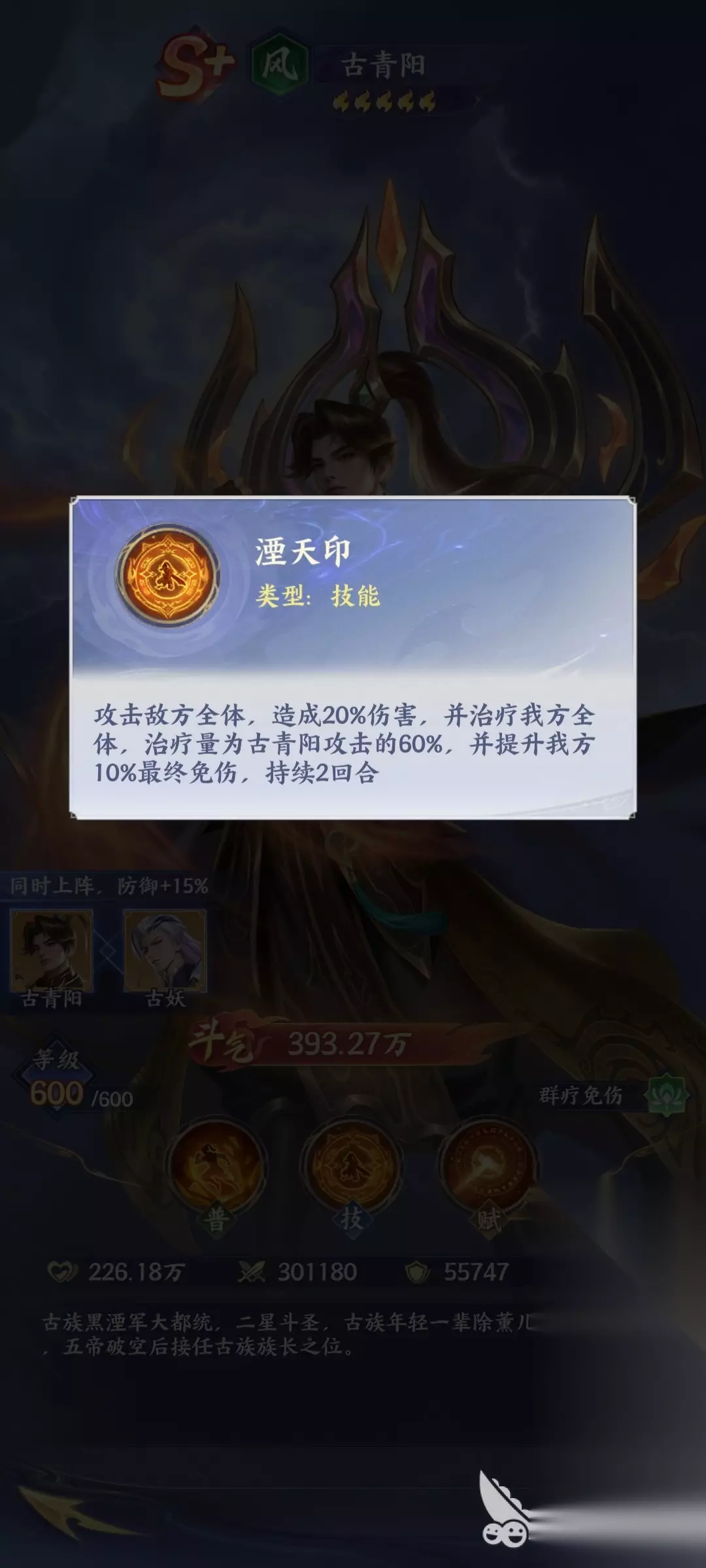 湮天印作为古青阳的核心技能,他其实能够让整个团队的实力大幅度的上升,因为在战斗的过程当中,它能够有效地攻击敌人,造成伤害的同时还能够给自己的队伍提供治疗量,一旦处于这样的情况下,能够让整个队伍直接处于免伤的状态,而这种状态通常持续的效果有两个回合,也正是因为它拥有这样的战斗技能,能够让整个队伍的增益效果得到提升,也能够在关键的时候达到改变战局的目的。