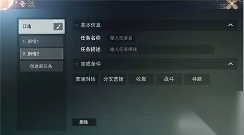 《楚留香》剧情编辑选择 我们随机点击其中一环任务,会切换到对应任务的编辑内容。这一条内容由基本信息、完成条件两个部分组成。基本信息包括任务名称与任务的描述,每一环任务都需要设置一个完成条件。目前共开放普通对话、分支选择、收集、战斗、寻路五类完成条件。