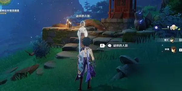 2、到达荒废神社后我们进行调查,调查期间我们需要与三个谜样人影进行对话,然后让其来到狐狸雕像这里。