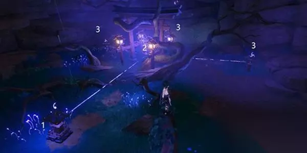 5、完成以上的几个步骤后我们需要前往寻找天狐雕像,接着按照顺序念出言灵就能拿到镇物道具。 7、然后我们去寻找结界,使用在绀田事话任务中获得的钥匙前往枯井底下。