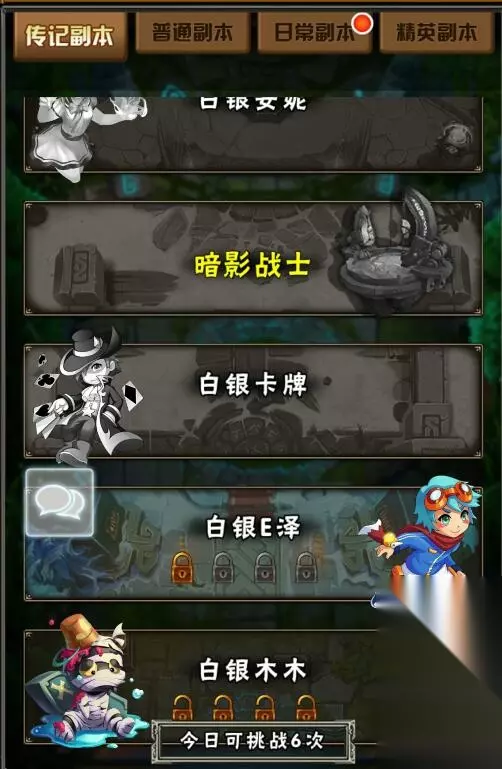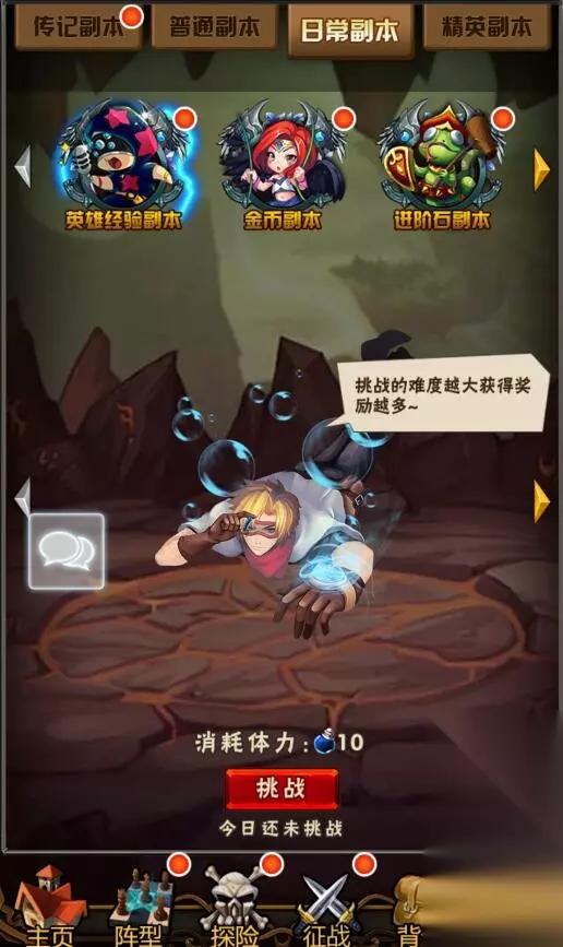 日常副本:官方活动和系统设定的周期性活动举办地,活动副本分为多种,有针对英雄卡牌的英雄经验副本,金币副本,进阶石副本、符文经验副本、精炼石副本和符文精华副本。 日常副本作为福利副本来说,是每天必刷的,根据自己现在当前的实际战斗力,选择对应难度的副本。每天只能挑战一次。
