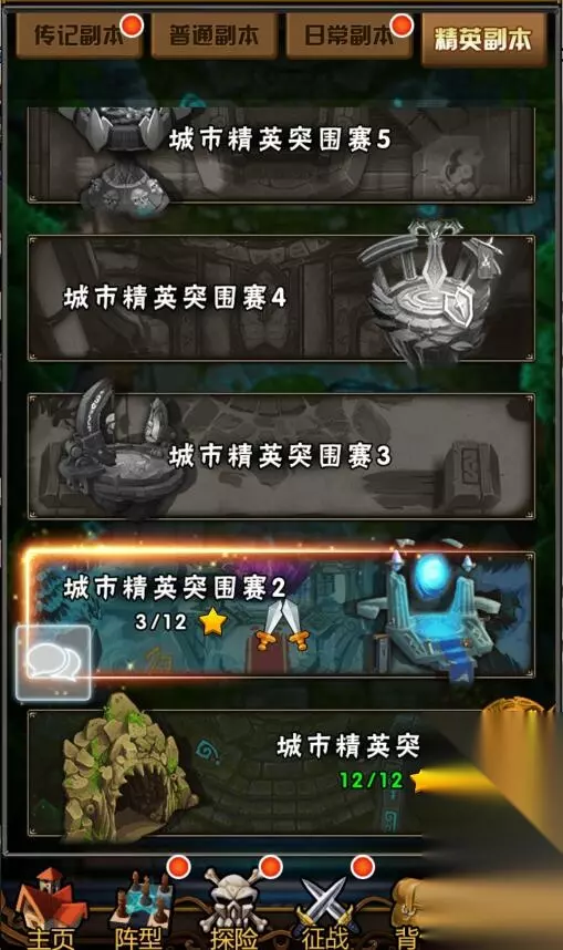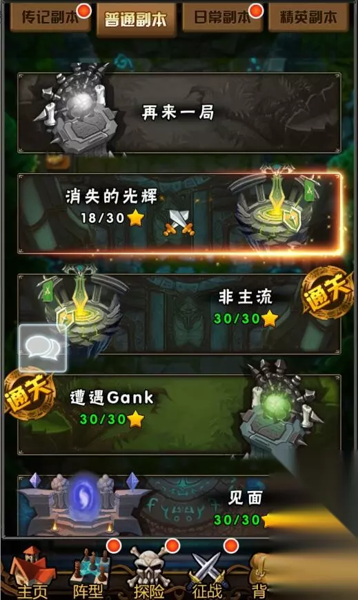 普通副本:普通副本有进入次数限制,有体力就可以刷,按照顺序往下刷,前期副本较为容易,对职业搭配要求低。可以获得经验,金钱,英雄或装备碎片。每次通关都可以按照对应的获得的副本星级开启星级宝箱,宝箱内有进阶石,金币,钻石,经验卡等奖励。