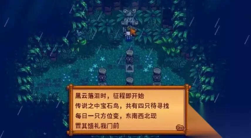 在完全放置好所有宝石后,就会有着一段剧情动画,并且得到金色核桃的奖励。姜岛的雨季相对来说是不太多的,玩家在首次遇到雨季时,可以通过降雨图腾,让第二天也继续下雨,这样就能最快完成宝石鸟的解密任务。玩家也可以纯靠运气来蒙宝石放置的位置,解密任务会选中五种颜色宝石的其中四种,在知晓两种或者三种宝石的位置,剩下的慢慢试也都是能成功。
