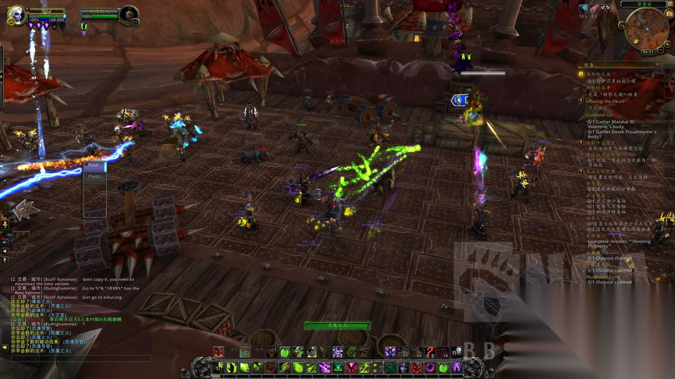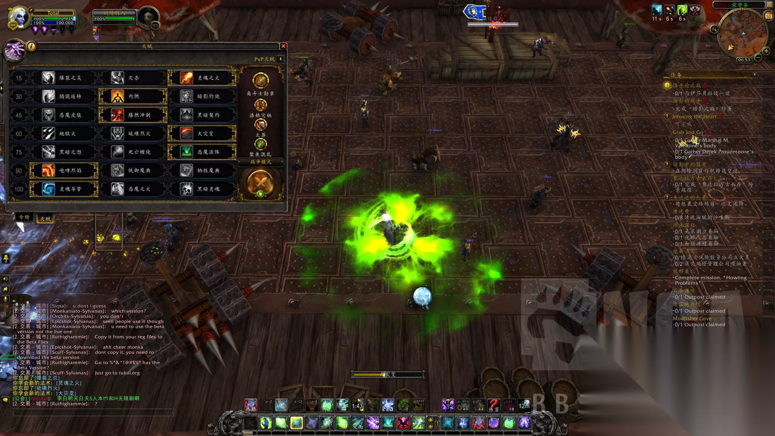 一些小TIPS 1.众所周知,术士在8.0迎来了一大波动画更新,各种动画史诗级buff。 但是如果你不喜欢这堆花里胡哨的动画的话,去做个绿火任务吧! 绿火任务仍旧保留了全部旧版特效和施法动作(当然很大概率是BLZ还没来得及做),并且完美兼容全部新技能特效。 也就是现在测试服里的术士拥有两套完整的动画,是其他职业的两倍。 2.由于在7.0对恶魔术和痛苦术的破坏式重做,各种绿火和这俩专精有关的技能被大量删除,所以现在绿火=毁灭专属。 3.绿火任务的剧情真是和现在的完美冲突,没有一个挨着的,所有的对话都被吃了。