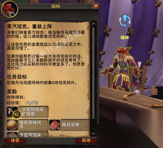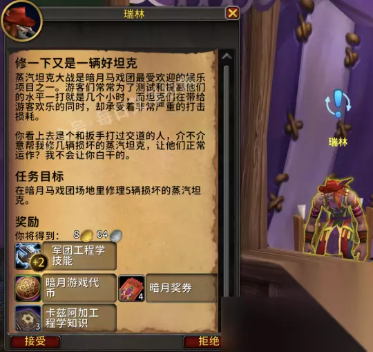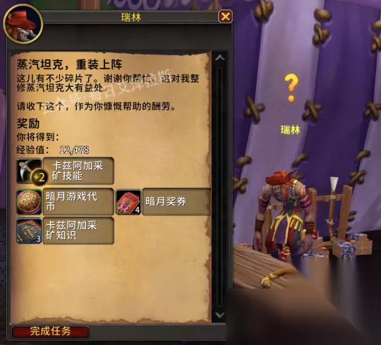 任务目标中损坏的蒸汽坦克可以在围栏附近找到,你只需要右键与它们互动即可开始修理,累计5辆就能完成任务。