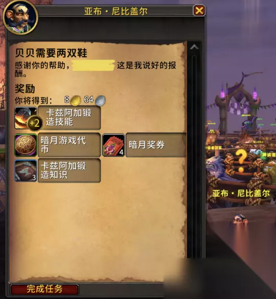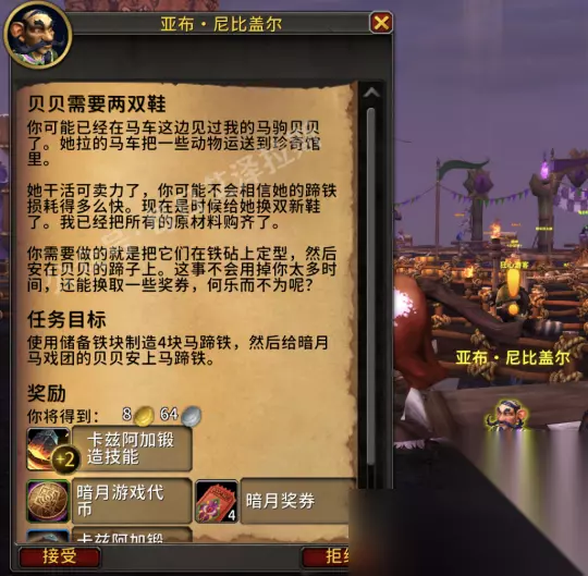 接完任务后NPC会塞给你储备铁块,你要做的就是找铁砧右键使用储备铁块制造马蹄铁。由于我还没发现暗月岛的铁砧在哪,所以为了完成这个任务,我选择了离开暗月岛(使用地图南部码头中间的传送门),返回闪金镇/莫高雷,寻找锻造训练师附近的铁砧来制作马蹄铁。 *也欢迎知道暗月岛铁砧位置的朋友在留言区分享位置。