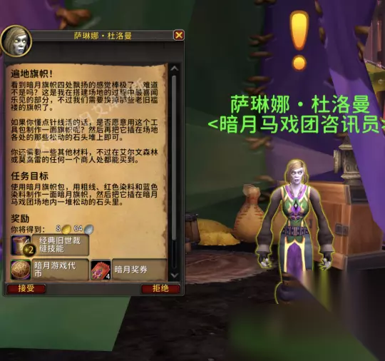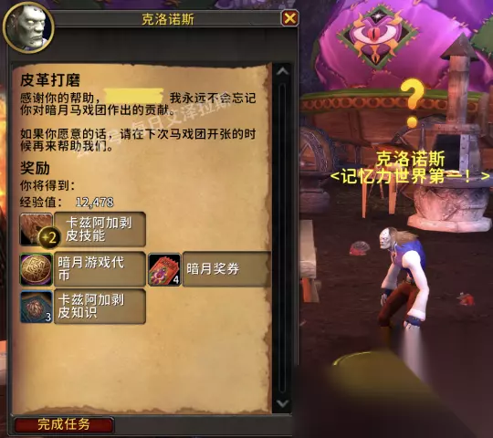 魔兽世界的11.0版本终于正式上线了,小伙伴可以重新回国服体验游戏了,每月一度的暗月马戏团周现已正式开启,那么下面就给大家带来魔兽世界11.0暗月马戏团全专业任务攻略。 魔兽世界11.0暗月马戏团全专业任务攻略 每月一度的暗月马戏团周现已正式开启!今天来介绍暗月马戏团全专业任务攻略。 2个机制提前了解 ●专业任务为每月一刷新。 ●专业任务奖励的技能点数采用追溯制,即以你当前最高版本的专业技能点向下兼容,例如你的卡兹阿加铭文技能点还未达到100点,那么专业任务奖励就会给予你对应的卡兹阿加铭文技能点,反之则会给予你其它已学习但还未冲满的铭文技能点,如库尔提拉斯铭文。 4个专业提前做好准备 尽管多数专业的专业任务可以从头到尾都在暗月岛上完成,但仍然有4个制造业需要你在进入暗月岛前先行购买材料,才能实现站桩做任务。 1裁缝:粗线x1,红色染料x1,蓝色染料x1 *可从裁缝供应商处购买; 2铭文:轻羊皮纸x5 *可从铭文供应商处购买,或现场骑乘旅行者的苔原猛犸象找机器人购买; 3炼金:月莓汁x5 *可从旅店老板处购买; 4制皮:粗线x5,蓝色染料x5,闪光的小珠x10 *粗线与蓝色染料可从制皮供应商处购买,闪光的小珠则需要从渔具供应商处购买(他们一般位于钓鱼训练师附近)。 以下是目录与NPC位置: 1裁缝 - 萨琳娜·杜洛曼(坐标55,55)2炼金术 - 塞兰妮亚(坐标50,69)3锻造 - 亚布·尼比盖尔(坐标51,82)4铭文 - 塞格(坐标53,76)5附魔 - 塞格(坐标53,76)6工程学 - 瑞林(坐标49,61)7采矿 - 瑞林(坐标49,61)8制皮 - 瑞林(坐标49,61)9剥皮 - 克洛诺斯(坐标55,70)10草药学 - 克洛诺斯(坐标55,70)11珠宝加工 - 克洛诺斯(坐标55,70) 裁缝 发放裁缝专业任务的NPC为萨琳娜·杜洛曼(坐标55,55)