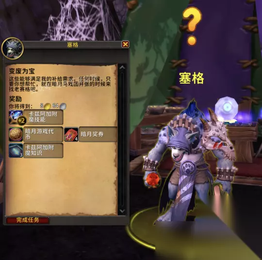 打开背包右键使用“一包奇异的草药”即可制作预言墨水。至于轻羊皮纸,你可以返回闪金镇或莫高雷,从商人或主城铭文供应商处购买。如果你已拥有坐骑旅行者的苔原猛犸象,那么可以直接上坐骑找修理机器人购买。 准备好轻羊皮纸后,右键使用“预言墨水”即可开始制作任务物品。 附魔 发放附魔专业任务的NPC为塞格(坐标53,76)
