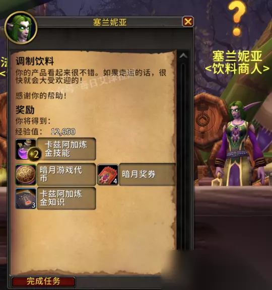 如果你已准备好月莓汁,那么使用背包里的调酒器站桩搓好5瓶月莓泡沫饮料即可完成任务。反之你还需要离开暗月岛(使用地图南部码头中间的传送门),返回闪金镇/莫高雷从旅店老板处购买月莓汁。