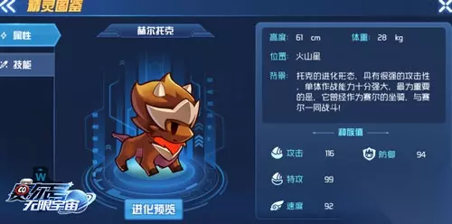 赫尔托克 赫尔托克曾经是赛尔们的坐骑,是赛尔们并肩战斗的最忠实的伙伴之一。在各大火系精灵排行榜上,赫尔托克总是名列前十。具有强大的攻击性,单体作战能力十分强大。未进化形态为托克,常年生活在火山中,由于性情凶悍且战斗力极强,而且平时生活在火山星南部的乱石山里,想要抓住他们,需要费些功夫。