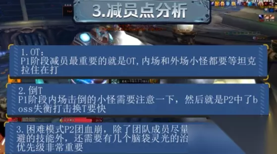 普通的难度的减元点有两个,第一就是p1阶段的减员,最重要的就是小怪的OT,内场和外场小怪都一定要等坦克建立一下仇恨再打,千万不要贪输出,第二就是倒T,P1阶段内场击倒的小怪需要稍微注意一下。然后就是P2阶段中了BOSS失衡打击换T一定要快。 困难模式的减原点就是如何对抗P2阶段团队巨大的冰霜伤害,除了团队成员尽量规避好每一个可规避的技能之外,还需要有几个脑袋比较灵光的治疗,明白刷血的优先级非常重要,如果你的团队治疗是短板,那么可以不用考虑去H模式了。 打法总结: 托利姆这个BOSS例子在普通难度基本等于白给,H模式确实是一个团队硬实力的检测,不光是要有好的坦克和治疗,DPS也是至关重要的,如果你的团队能够击杀困难的托里姆,那么后面的BOSS应该也没有什么太大的问题。