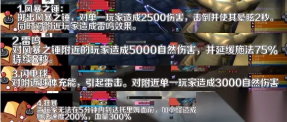 P1阶段和P2阶段BOSS的技能是不一样的,P1阶段BOSS站在台阶上丢技能。BOSS还有一个狂暴技能,当玩家5分钟内无法到达托利姆面前,将启动该技能增加所有小怪伤害500%,也就等于是一个灭团技。