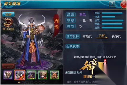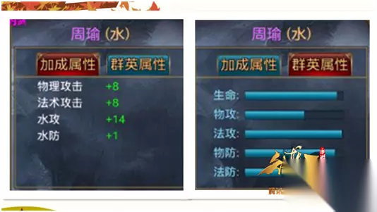 基础情况: 副将名称:周瑜 副将品质:紫色 副将属性:水 副将初始属性: 物理攻击:+8 法术攻击:+8 水攻:+14 资质数据: 生命:★★★★☆ 物攻:★★☆ 法攻:★★★★☆ 物防:★★★★☆ 法防:★★★★☆ 携带兵种:方盾兵 获取方式:寄售、群英战场、副将招募。