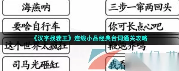 小品节目是非常好看且搞笑的,一些经典的句子就会被观众们深刻记住,在汉字找茬王的游戏中就有连线小品经典台词的挑战关卡,几乎没有什么挑战难度,接下来233乐园小编就给大家整理了攻略部内容,感兴趣的小伙伴继续往下看看吧。