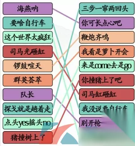 通关任务:连线经典小品台词 1、关卡是经典的连线玩法,左右两侧对应的是经典小品的句子,将其进行连线即可过关; 2、都是一些比较常见的小品句子,而且都是出自比较搞笑的小品作品中的; 3、我们可以先把自己知道的先连线,不清楚连线答案的可以参考以下的答案; 海燕呐,你可长点心吧 要啥自行车,我没说要自行车 这个世界太疯狂,耗子给猫当伴娘 司马光砸紅,司马缸砸紅 锣鼓喧天,鞍炮齐鸣 点头ycs摇头m,来是come去是gp 队长,别开枪 探戈就是趟着走,三步一窜两回头 猪撞树上了,你撞猪上了吧