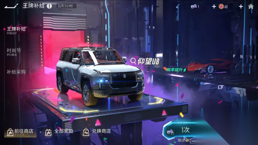 『至臻时装 -天宫织梦』太空浩瀚 ,岁月悠长,我们共处同一个时空,是一场千载难逢的意外。至臻时装天宫织梦,与你一起在星球间跳舞,在银河里流浪。 『轮毂 -浑天仪』轮毂内织星象,日月辉映,环绕着象征时间流逝的十二节气字符——天在地外,水在天外,夜观星象,可知天下大事。 『涂装 -萌意巧拼』是谁拼出了一只摇尾萌萌虎?过渡圆润,拼接精准,连特效都方方正正整整齐齐真是手艺精湛!适用车型:摇尾萌萌虎。 王牌补给 前卫硬朗,势不可挡!6月7日起,王牌补给将开启全新活动!传说车辆『仰望U8』限时概率提升66%!