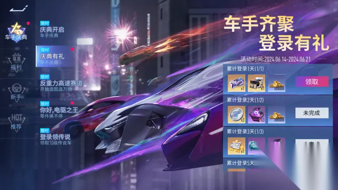 车手齐聚,登录有礼 6月14日~6月27日,登录游戏即可领取十连采购券,累计登录还有传说蓝图碎片、王牌补给券、外观币、万能零件等好礼相送!