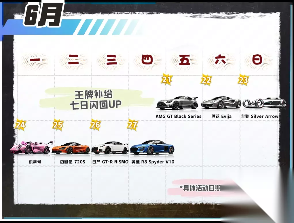七日闪回 七日闪回,重磅回归!6月21日~6月27日,王牌补给将开启特别活动——七日闪回!每天都会有一辆传说车辆限时概率提升66%,快快拿下自己新衣的爱车吧:6月21日梅赛德斯-AMG GT Black Series概率提升,6月22日莲花 Evija概率提升,6月23日梅赛德斯-奔驰 Silver Arrow概率提升,6月24日凯蒂号概率提升,6月25日迈凯伦 720S概率提升,6月26日日产 GT-R NISMO概率提升,6月27日奥迪 R8 Spyder V10概率提升!(七日闪回将与王牌补给共享抽奖和保底进度!)