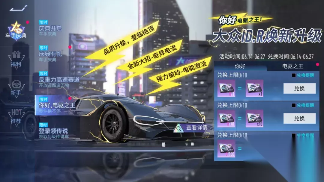 『全新大招-易四方』开启大招时获得加速并提升转向能力并原地掉头在赛道中反向行驶5秒:未避让的敌方车辆将受到冲击侧移15米;若敌方车辆侧移撞墙则额外损失25%大招能量;大招结束时回到开启大招时的位置并向前闪现反向行驶的距离;大招期间再次点击大招可使大招立即结束。 『被动特性-磅礴气势』QTE起步时获得2秒额外的加速时间,碰撞不损失集气量,在特殊地形中不会减速。 福利活动 『你好,电驱之王』6月14日~6月27日,登录即可获得大众 ID.R限时体验卡,让全体车手第一时间体验到奇异电流的乐趣。完成专属任务还可免费领取海量专属零件和专属蓝图,助力车手升级。西理提醒你,补给卡池里有概率获得大众 ID.R哦,还没有拥有的赛车手可千万不要错过哦~