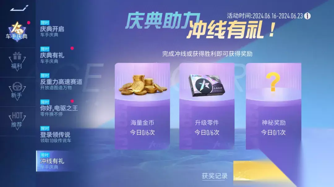 官图评选计划 新活动来咯!6月21日~7月4日,可以为喜欢的乐园地图投票啦,有机会变成官方赛道进入练习赛或排位赛,多多支持你喜爱的乐园地图吧! 冲线有礼 庆典助力,冲线有礼。6月16日~6月23日,车手们完成冲线或获得胜利即可获得神秘奖励,海量金币、升级零件,更有传说蓝图等着你!
