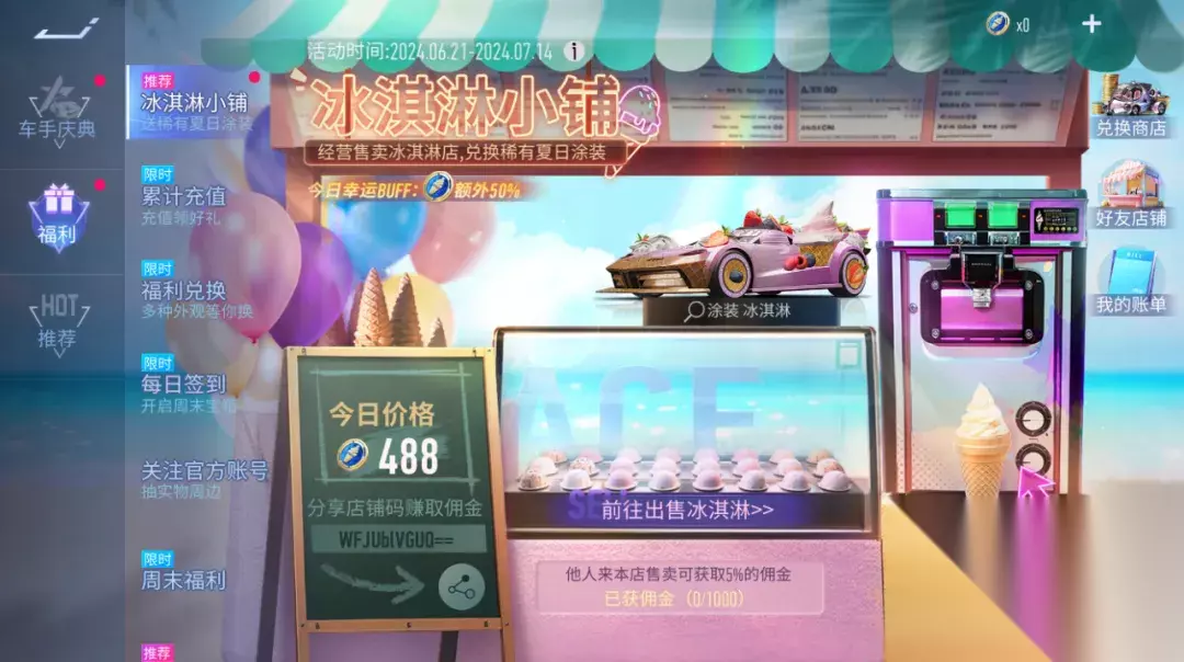 冰淇淋小铺 夏日限定冰淇淋小铺开张,免费兑换海量涂装!6月21日~7月14日,出售冰淇淋可获得夏日币,十余款赛车潮改、王牌补给券、十连采购券等随心兑换,更有全新涂装-冰淇淋哦~不同车手店铺里的冰淇淋售价不同,找到高价店铺可加速积攒夏日币~本期加入了每日随机事件,双倍制作、额外获得夏日币、西理来借车等多种BUFF,夏日币UPUP~