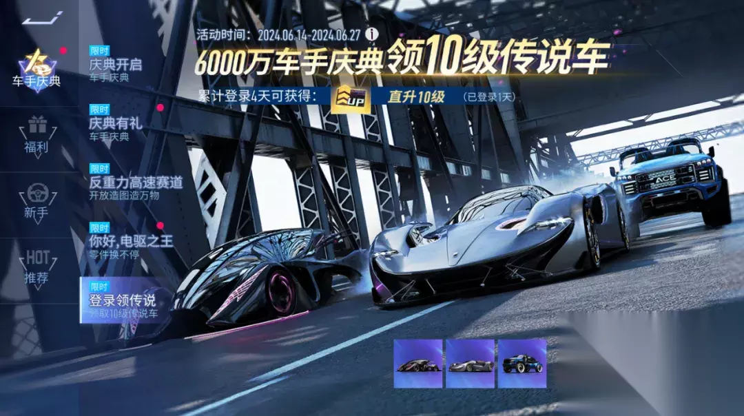 登录领传说 6月14日~6月27日,登录分享即可领取一辆传说车:终极·异形、洛基、逮虾货运;累计登录速度节还可以领取一张10级直升卡,各位车手千万不要错过呦~