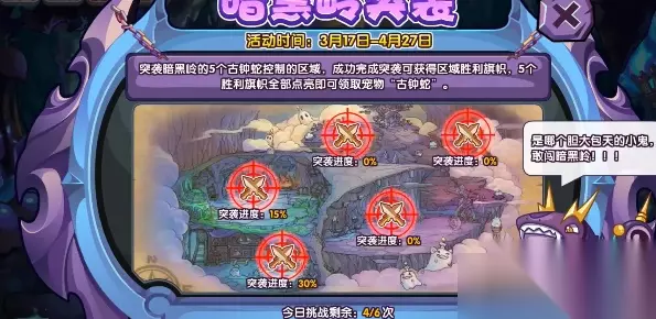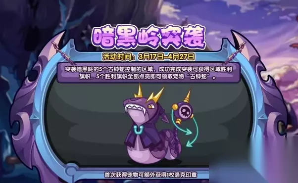 想要获得新的宠物看过来吧,今天小编带来的是洛克王国暗黑岭突袭活动攻略,玩家突袭暗黑岭的5个古钟蛇控制的区域,成功完成突袭可获得区域胜利旗帜,5个胜利旗帜全部点亮即可领取宠物古钟蛇i,疫情往下看看吧。