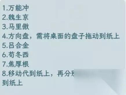 答案如下所示: 1、全民抢购 2.魏胜景 3.马里奥 4.方向盘,需要将桌子上的盘子拖到纸上 5. 陆呵呵 6.苟东喜 7.焦厚根 8. 将代理移动到纸上,然后将父母的脸分别拖到纸上。