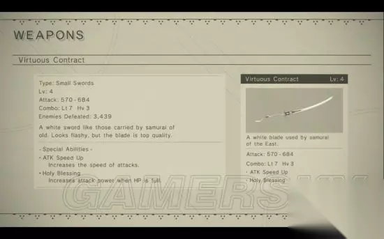 获得方法: 2B初始武器。 属性: 等级 攻击力 连招 特性特效 升级所需材料 1 270 - 324 Light: 4 Heavy: 2 N/A N/A 2 270 - 324 Light: 5 Heavy: 2 ATK Speed Up Rusted Clump x5, Beast Hide x5, Crystal x5 3 420 - 504 Light: 6 Heavy: 3 ATK Speed Up Dented Plate x4, Titanium Alloy x3, Severed Cable x3, Amber x2 4 570 - 684 Light: 7 Heavy: 3 Holy Blessing Memory Alloy x2, Severed Cable x5, Pristine Cable x3, Machine Arm x2, Moldavitex1 特性特效: Level 2: Attack Speed Up - 增加攻击速度。 Level 4: Holy Blessing - 满生命值状态下攻击力增加。 黑之誓约