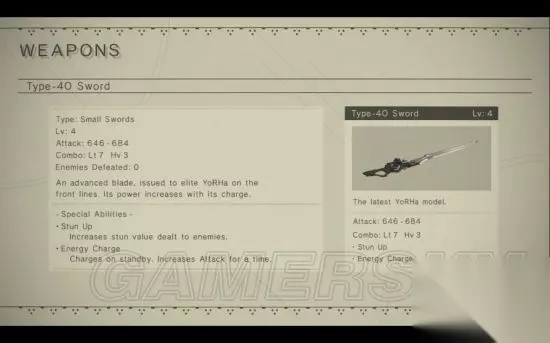 获得方法: ①森之国章节,在废墟都市铁塔附近接到无线通信,触发任务「通信环境的调查」; ④在沙漠油田找到沙漠玫瑰后完成任务获得奖励- 4O式战术刀。 属性: 最高等级攻击力:646-684 最高等级combo:Light 7,Heavy 3 特性特效: Level 2: Stun Up - 增加晕眩率。 Level 4: Energy Charge - 不攻击的时候蓄力能够增加伤害。 三式战术刀