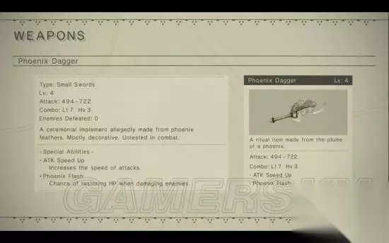 获得方法: 抵抗军营地武器商店出售(10000G) 属性: 等级 攻击力 连招 特性特效 升级所需材料 1 190 - 210 Light: 5 Heavy: 2 N/A N/A 2 342 - 378 Light: 6 Heavy: 2 Endurance Up Copper Ore x5, Stretched Coil x3, Pyrite x5 3 532 - 588 Light: 6 Heavy: 2 Endurance Up [Wait more information] 4 722 - 798 Light: 7 Heavy: 3 Endurance Up + Beast's Roar Gold Ore x2, Stripped Screw x5, Pristine Screw x3, Machine Arm x2, Meteorite x1 特性特效: Level 2: Endurance Up - 增加防御力。 Level 4: Beast's Roar - 近战判定范围增大。 不死鸟短剑