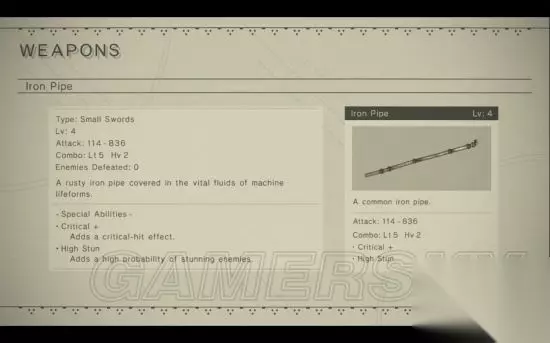 获得方法: 三周目在水没都市资源回收塔第二层右边的宝箱开启获得。 属性: 等级 攻击力 连招 特性特效 升级所需材料 1 160 - 190 Light: 5 Heavy: 3 N/A N/A 2 320 - 380 Light: 5 Heavy: 3 ATK Speed Up 2,500G, Rusted Clump x5, Broken Circuit x3, Pyrite x5 3 448 - 532 Light: 6 Heavy: 3 ATK Speed Up 5,000G, Dented Plate x4, Titanium Alloy x3,Broken Battery x3 Meteorite Shard x1 4 608 - 722 Light: 7 Heavy: 3 ATK Speed Up + Bullet Absorb Gold Ore x2, Rusty Bolt x5, New Bolt x3, Machine Arm x2, Meteorite x1 特性特效: Level 2: ATK Speed Up - 增加攻击速度。 Level 4: Bullet Absorb - 切子弹回血。 铁管