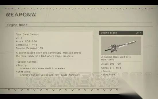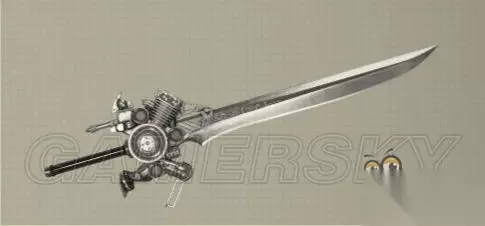 获得方法: 帕斯卡尔的村庄里武器商店可以购买。 属性: 等级 攻击力 连招 特性特效 升级所需材料 1 140 - 210 Light: 4 Heavy: 1 N/A N/A 2 252 - 378 Light: 4 Heavy: 1 Robot Discount Copper Ore x5, Broken Key x5, Crystal x5 3 392 - 588 Light: 5 Heavy: 2 Robot Discount Iron Ore x4, Silver Ore x3, Dented Socket x3, Amber x2 4 392 - 588 Light: 6 Heavy: 3 Robot Discount + Machine Brand Gold Ore x4, Dented Socket x5, Sturdy Socket x3, Machine Arm x2, Moldavitex2 特性特效: Level 2: Robot Discount - 在机器人商店里面购买东西时有折扣。 Level 4: Machine Brand - 击倒敌人数量越多伤害越高(最大500) 引擎剑