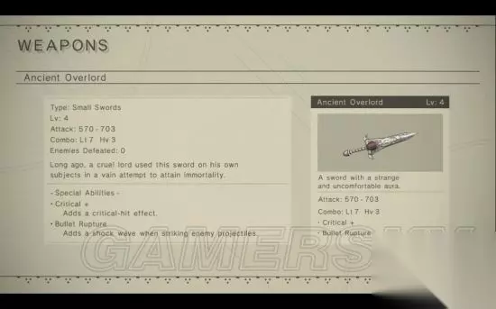 属性: 等级 攻击力 连招 特性特效 升级所需材料 1 160- 200 Light: 5 Heavy: 3 N/A N/A 2 288- 366 Light: 6 Heavy: 3 Stun Up Rusted Clump x5, Broken Circuit x5, Pearl x3 3 448 - 560 Light: 6 Heavy: 2 Stun Up Dented Plate x4, Titanium Alloy x3, Broken Battery x3, Black Pearl x2 4 608 - 760 Light: 7 Heavy: 3 Stun Up + Shift Avoid Memory Alloy x2, Broken Battery x5, Large Gear x3, Machine Arm x2, Moldavitex1 特性特效: Level 2: Stun Up - 增加晕眩率。 Level 4: Shift Avoid - 伤害数字以及回避光效改变。 如转载涉及版权等问题,请作者与我司联系,我司将在第一时间删除或支付稿酬。