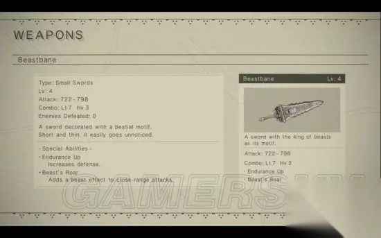 属性: 等级 攻击力 连招 特性特效 升级所需材料 1 30 - 220 Light: 4 Heavy: 2 N/A N/A 2 54 - 396 Light: 3 Heavy: 1 Critical + Copper Ore x5, Broken Spring x5, Crystal x5 3 84 - 616 Light: 4 Heavy: 2 Critical + Iron Ore x4, Silver Ore x3, Small Gear x3, Amber x2 4 114 - 836 Light: 5 Heavy: 2 Critical + High Stun Gold Ore x2, Small Gear x5, Large Gear x3, Machine Arm x2, Moldavitex1 特性特效: Level 2: Critical+ - 增加暴击率。 Level 4: High Stun - 高概率晕眩。 百兽之剑