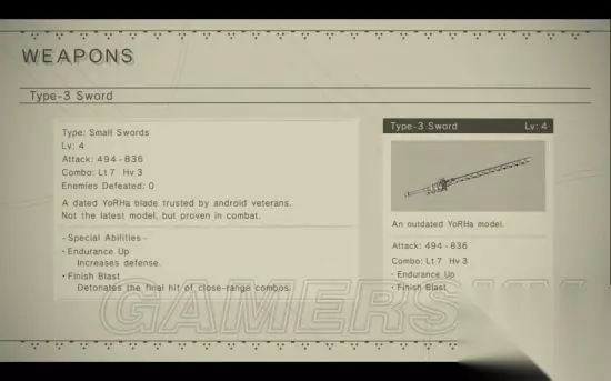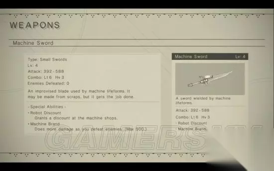 属性: 等级 攻击力 连招 特性特效 升级所需材料 1 150 - 180 Light: 4 Heavy: 2 N/A N/A 2 270 - 324 Light: 5 Heavy: 2 Discount Rusted Clump x5, Stretched Coil x5, Broken Key x5 3 420 - 504 Light: 6 Heavy: 2 Discount Dented Plate x4, Titanium Alloy x3, Rusty Bolt x3, Pyrite x3 4 570 - 684 Light: 7 Heavy: 3 Discount + Pod Charge Memory Alloy x2, Rusty Bolt x5, New Bolt x3, Machine Arm x2, Moldavitex1 特性特效: Level 2: Discount - 在抵抗军的商店里面购买东西时会有折扣。 Level 4: Pod Charge - POD技能冷却时间减少。 机械生命体之剑