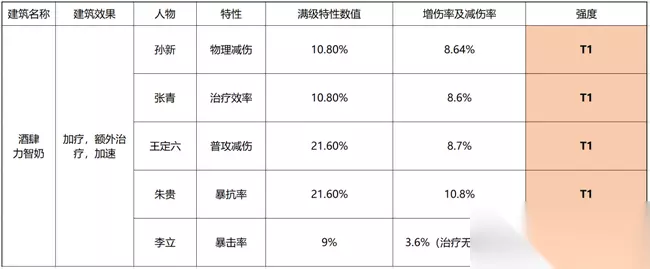 酒肆 酒肆的特性较为贴合实际,孙新、王定六、朱贵为减伤向,张青增强治疗功能,都是T1程度由于治疗无法暴击,李立的暴击率加成与酒肆的定位不配适。