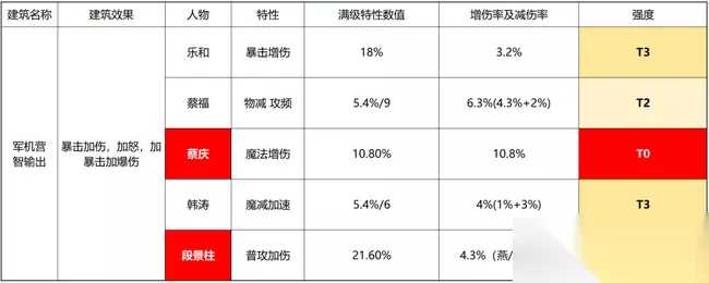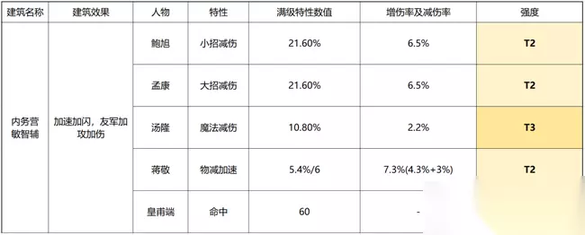 内务营 内务营的辅助效果尚可,特性相对较弱,在物理伤害/普攻伤害作为重点防范对象的环境下强度普遍不高,仅蒋敬的物减及加速效果比较实在。 玩家在巅峰赛和班级站的阵容中的核心卡一般不超过10个,核心卡培养的重要性是远超过非核心卡的,而心愿单正好也是十张卡,所以把性价比最高的副将搭配给核心卡并进入心愿单,是收益最高的培养之路。因而建议集中培养10张高性价比副将,达到200级再视情况继续培养或更换,有的玩家可能T3。 而在培养卡的选择中,培养卡的建筑相对集中,则核心能获得更高的建筑属性效果和建筑技能等级加成。过于集中则不能兼顾所有核心。比较之下仅内务营没有强度值得进心愿单(T1及以上)的卡,因此建议主力不进内务营,内务营不进心愿卡,能取得更高收益。
