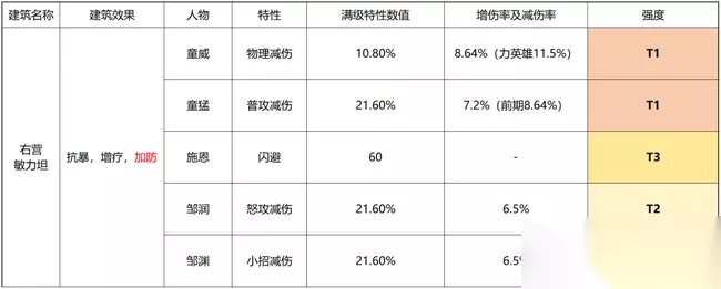 右营 首先一点,右营能提升防御力,300级之后能提升百分比防御,在调整最低防御卡时能发挥重要作用。 右营童威童猛两兄弟特性格外突出,其中童威在配置于力英雄时,物理减伤率=10.8%/65%= 14%,配合右营的加防,是卢俊义的不二选择;童猛的普攻减伤效果实在,尤其在第一轮放大期之前作用更加明显;邹润邹渊中规中矩。