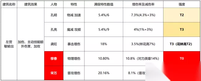 经过副将系统扩充后,副将系统已成完全体,所有副将都已出场且出现心愿单,这给副将培养体系带来巨大变化:玩家会集中培养心愿单中的12个副将。而副将怎么搭配,怎么选择心愿单,玩家需要一个系统的搭配,接下来就尝试来厘清搭配和培养思路。 各建筑及其副将特点 将满级属性量化成增伤率及减伤率,环境模型为: 物理伤害/法术伤害占比为4:1; 物理伤害:普攻/小招/怒攻占比为4:3:3 ; 法术伤害:普攻/小招/怒攻占比为2:4:4; 闪避/命中机制未知,暂按T3处理; 左营 孔明孔亮是攻防兼备的副将,孔明T2可堪一用;龚旺是人气副将,但18%的暴伤在204%基础爆伤对比下作用就十分有限了,假使认为林冲、花荣暴击率100%,他们250%左右的高爆伤率依旧拉低增伤率至7%左右。 相比之下穆春的物理增伤收益就更加稳健,尤其在攻击力英雄时(0星传说+/传说2套装物理减伤率35%左右),物理伤害能由65%提升至75.8%,则增伤率=10.8%/65%=14%;而宋万的收益也很高,尤其装备至林冲、花荣等普攻伤害占比达6成以上的卡时收益率能达到12%以上。