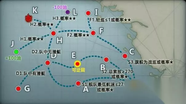 带路条件: 舰队最低航速不超过27节,舰队总索敌值达到270以上,旗舰为战巡,不同点可能要求不同的配置,如D点要求队中有潜艇,E点可迂回,F点根据舰队中轻巡和驱逐的数量有不同的可能路线。