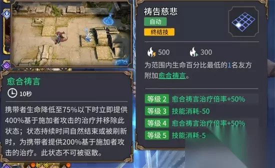 梯度:T0.5 关键词:回怒、减伤、致命保护、单体治疗 1、技能配置天赋: 治疗友方可添加静谧之息(额外治疗加成),并且可提供25%的物理/魔法减伤(最多存在2个静谧之息)。 回怒:给静谧之息单位友方提供治疗,可为自身回怒;自身在场可给友方提供每秒1%回怒(与树奶相当,可与树奶叠加),静谧之息友方每秒可回复2%怒气。 致命保护:每50秒可使范围内友方免疫1次致命伤害,如果有静谧之息,还能获得5秒免疫伤害状态。