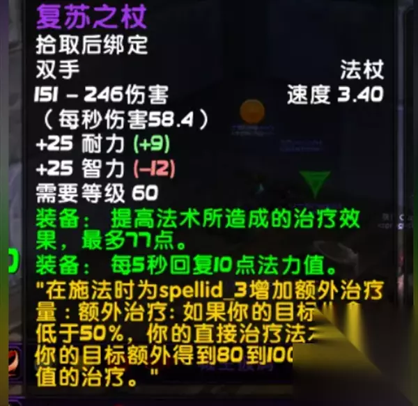 复苏之杖:装备后提高法术的治疗效果,并每五秒恢复法力值,获得额外治疗buff。