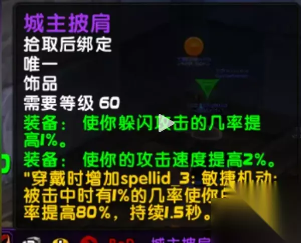 城主披肩:装备后让玩家的躲闪攻击的几率增高,也可以增加玩家的攻击速度,并会获得敏捷机动的buff。