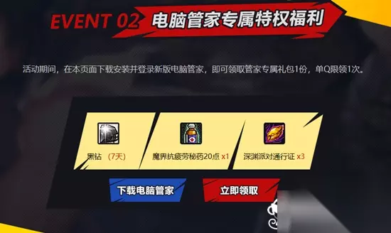 除此之外玩家还可以通过下载新版电脑管家来领取专属礼包一份,其中有7天黑钻和三个深渊通行证。