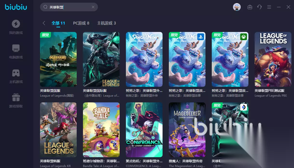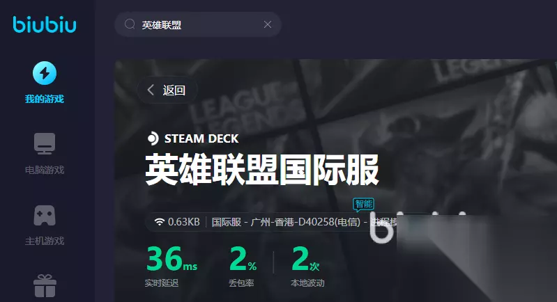 接着当然要去游戏里面使用了,各位在搜索栏输入英雄联盟就可以查找到游戏了,可见biubiu提供的服务是很多的,但是大家想要玩美服,那就点击第二个,接着在区服里面进行选择,就可以开始加速效果了。