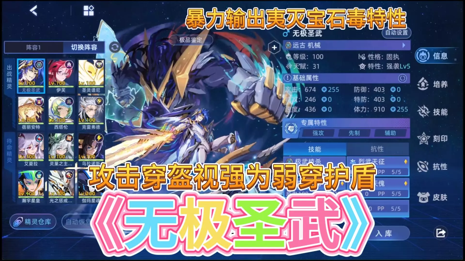 性格固执 特性强袭/坚硬/瞬杀(不推荐毒因为魂印效果)攻体255(攻速255也可 放不太出来目前主播自己给了攻体)双K1303+V1003 宝石建议双攻击给威力…